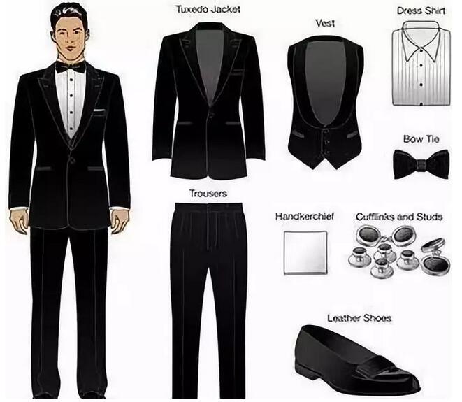 黑色西褲:也被稱為晚禮服長褲,袖長的褲腿是必要的,有助于修飾身形更加挺拔。